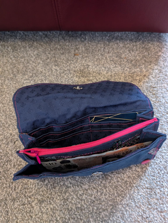 Blue purse with multicoloured dragonfly motif and blue lining. Includes zipped purse for coins and space for up to 6 cards.