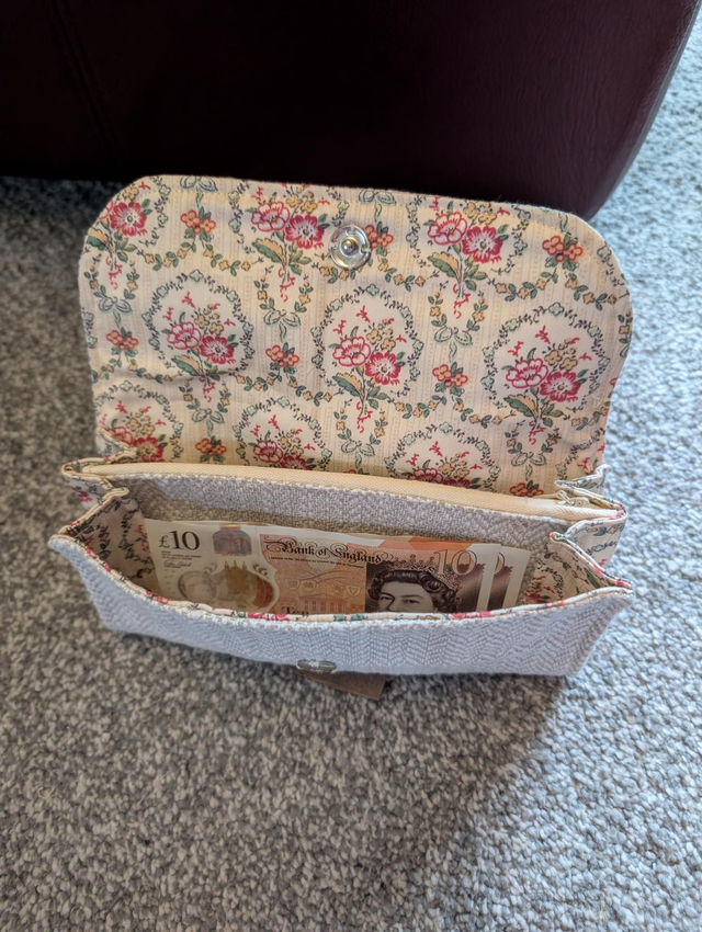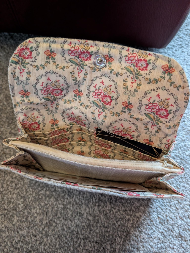 Cream purse with vintage style flowery lining. Includes zipped purse for coins and space for up to 6 cards.