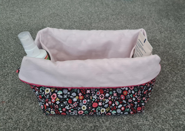 Large toiletry / make up bag with red / blue flower outer, pink zip and green lining