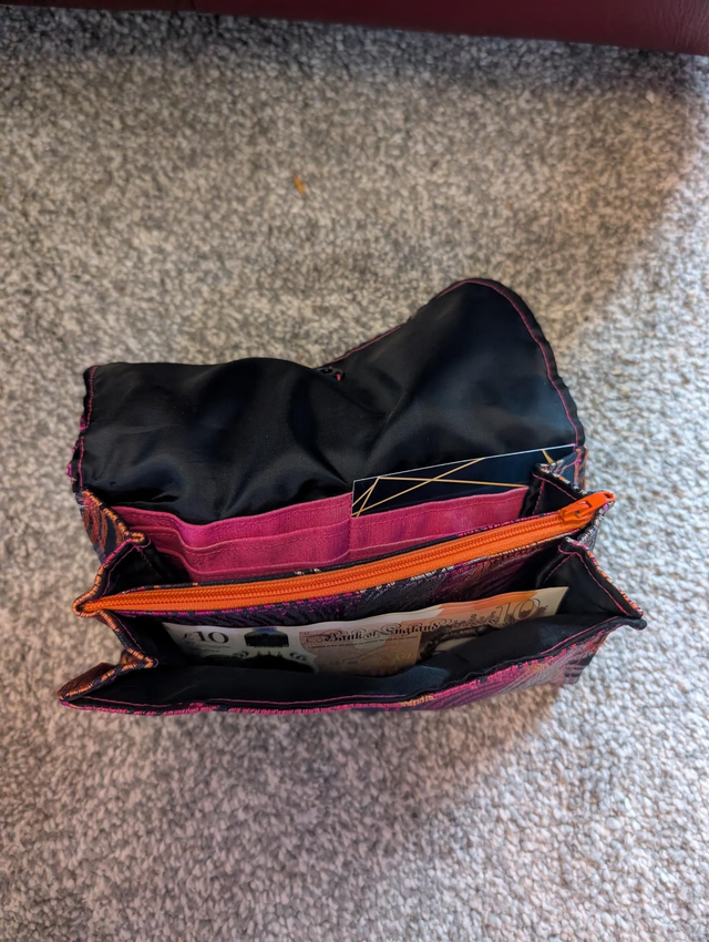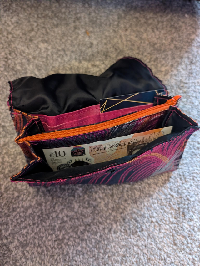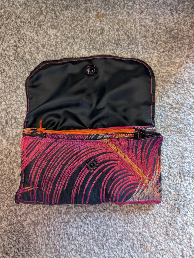Multicoloured purse with embroidered peacock feather motif and black lining. Includes zipped purse for coins and space for up to 6 cards.